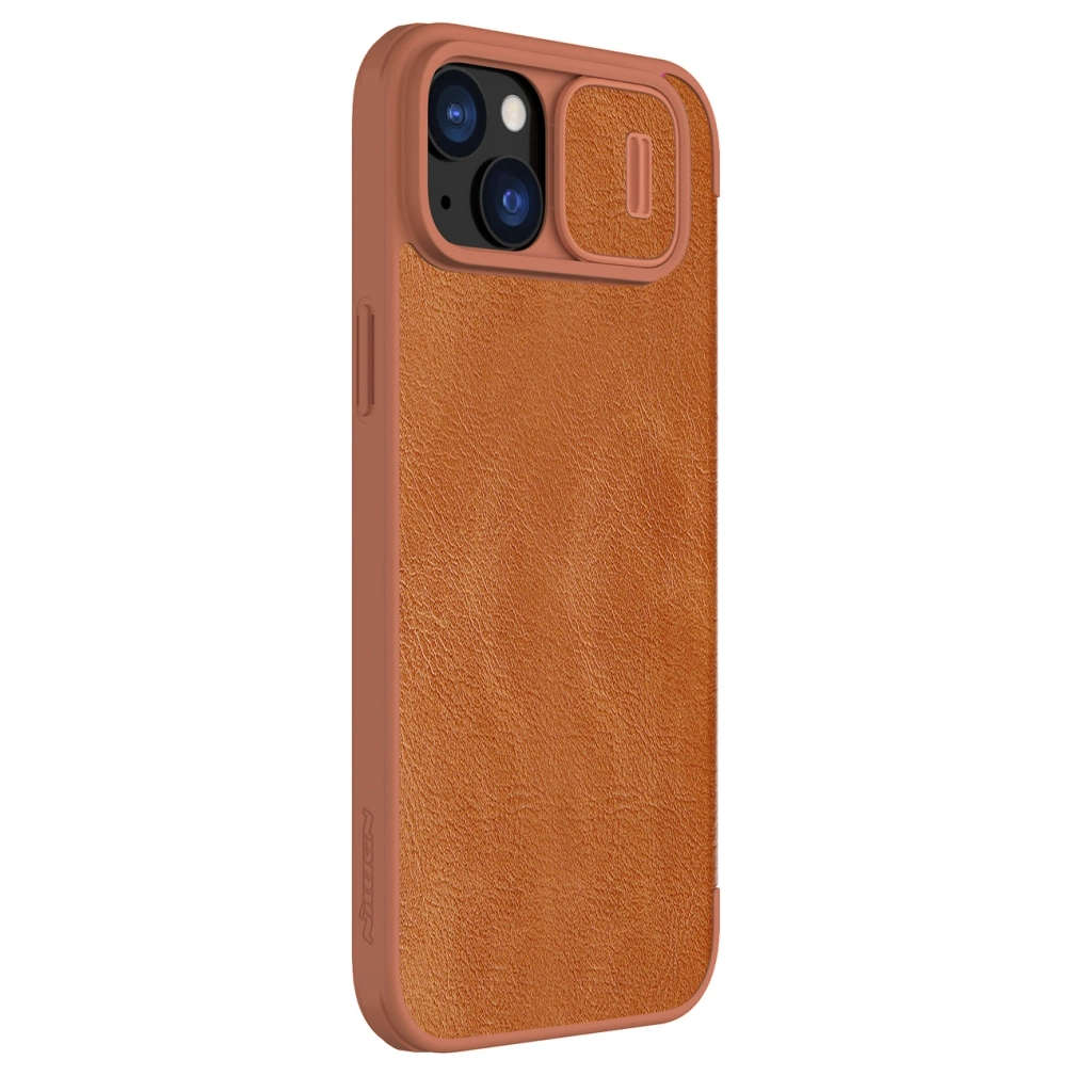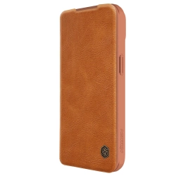 Skórzane etui Nillkin Qin Pro Leather z klapką i osłoną aparatu do telefonu iPhone 15 Plus w kolorze brązowym
