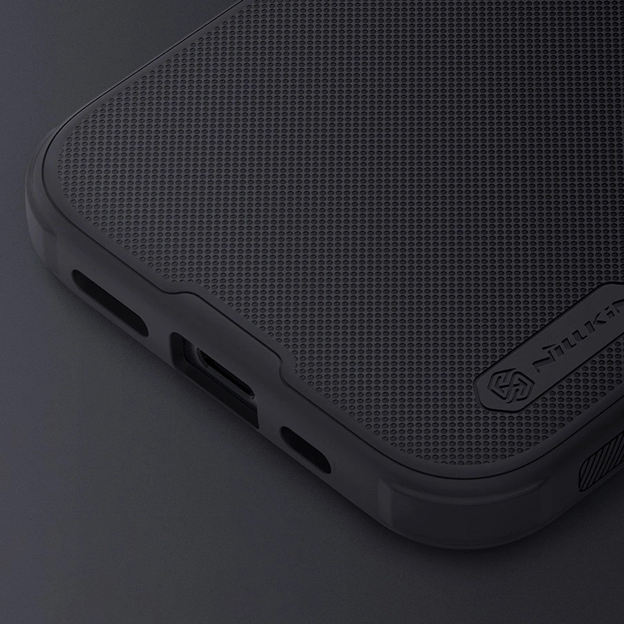 Etui z serii Super Frosted Shield Pro marki Nillkin to bardzo wytrzymały pokrowiec, który jest w stanie uchronić twój telefon od poważnego uszkodzenia po jego upadku na podłogę. Kupując nowy telefon warto jest od razu zaopatrzyć się w porządne etui, tym bardziej kiedy zdecydowałeś się na urządzenie z najwyższej półki cenowej. Wystarczy jeden nieostrożny ruch, żeby telefon spadł na ziemię. Pokrowiec składa się z elastycznej ramki z TPU i sztywnych plecków z PC. Ramka ułatwia zakładanie etui na telefon, a plecki usztywniają całą konstrukcję. Narożniki są ukształtowane w taki sposób, żeby działały jak zderzaki w samochodzie i absorbowały energię uderzenia. Podwyższone ranty dookoła tylnego aparatu i ekranu oddzielają te elementy od podłoża, na którym mogły by zostać porysowane.