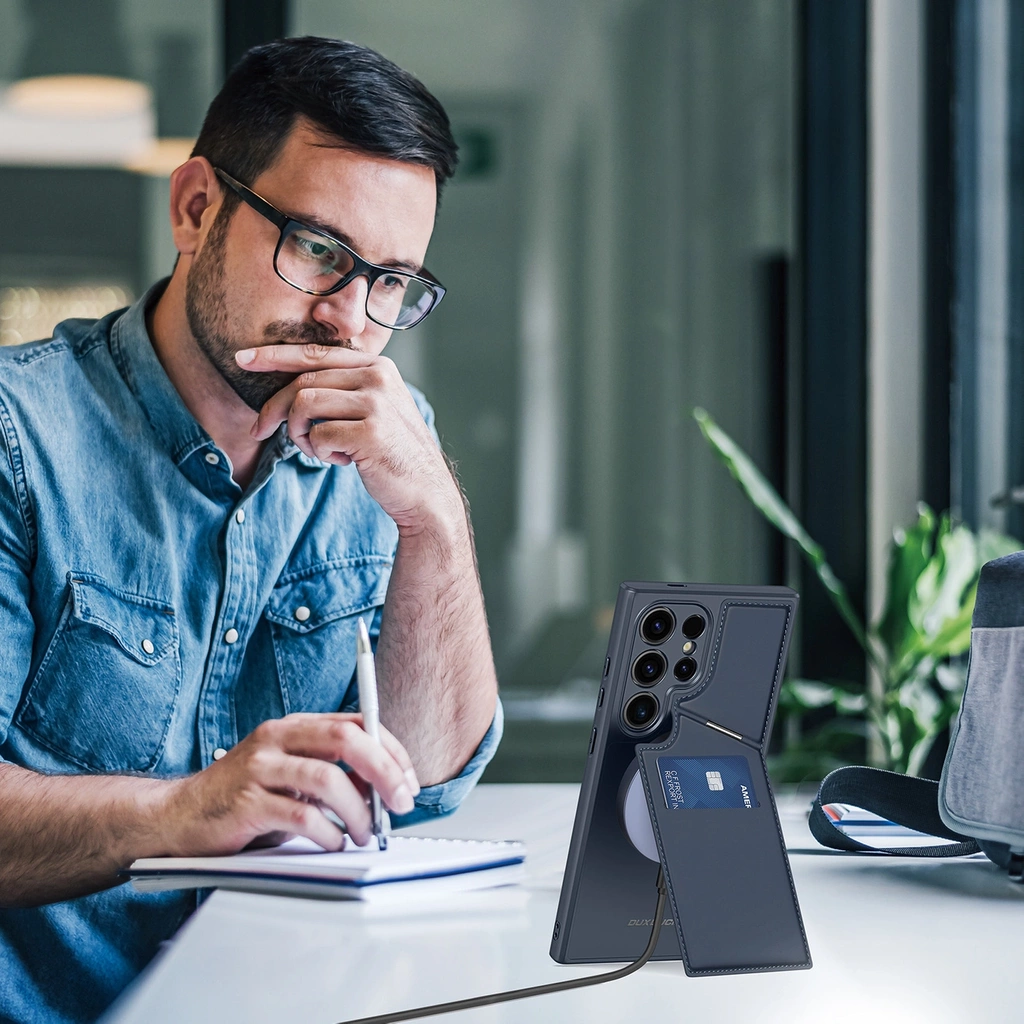 Etui zapewnia wygodne korzystanie z Samsung Galaxy S24 Ultra w orientacji pionowej bez trzymania go w dłoni. Dzięki regulowanemu kątowi nachylenia do 135°, możesz swobodnie oglądać filmy i prowadzić wideorozmowy.