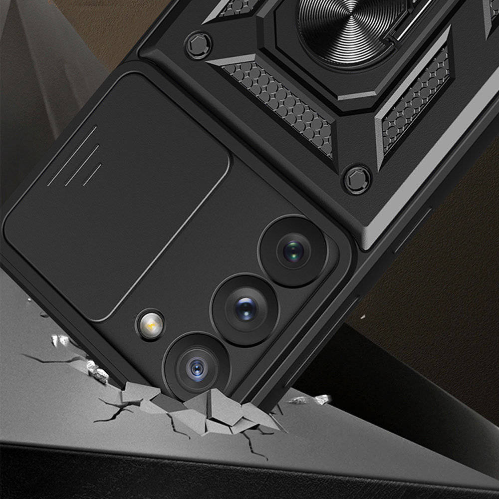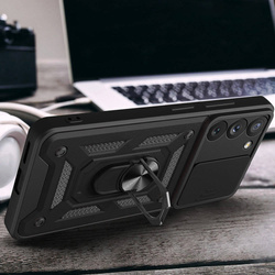 Pancerne etui z serii Hybrid Armor Camshield jest wykonane z termoplastycznego i wytrzymałego tworzywa, które swoim wyglądem imituje stal. Pokrowiec jest dopasowany do Samsung Galaxy S23 Ultra, doskonale chroni telefon przed zniszczeniami wskutek upadków lub zarysowań (na przykład przez noszone w kieszeni klucze). Pokrowiec posiada przesuwaną osłonę na tylny aparat. Dzięki niej szkło kamery jest chronione przed porysowaniem. Jest do też dodatkowy plus dla osób ceniących prywatność i bezpieczeństwo swoich danych. Zakryta kamera uniemożliwia dostęp do nagrywania obrazu w przypadku kiedy ktoś uzyska zdalny dostęp do telefonu i włączy podgląd z głównej kamery. Podniesione krawędzie dookoła ekranu zabezpieczają go od zarysowania kiedy ten leży na płaskiej powierzchni. Ma wbudowany metalowy ring, który pozwala na wygodne korzystanie z telefonu jedną ręką i pełni również funkcję podstawki. Wbudowana metalowa płytka sprawia, że można go przymocować do magnetycznych uchwytów samochodowych. Posiada responsywne przyciski i wycięcia na porty. Idealny dla osób, które cenią sobie styl, jakość i chcą zadbać o swoje urządzenie.