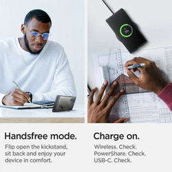 Obudowa wyposażona w nóżkę, umożliwia bezproblemowe oglądanie tego, co się dzieje na wyświetlaczu telefonu bez konieczności jego trzymania. Case jest idealnie dopasowany i nie ogranicza możliwości ładowania bezprzewodowego. Nieco podniesiona forma obudowy wokół aparatu i ekranu chroni go przed zarysowaniami, unosząc telefon tuż nad powierzchnią płaską. Posiada osłony na przyciski i wycięcia na porty.