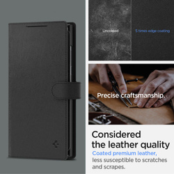 Niezwykłe etui o klasycznym i eleganckim wzornictwie Spigen Wallet "S" Plus. Etui wykonane jest ze skóry PU co sprawia, że futerał jest trwały oraz komfortowy w użytkowaniu. Wnętrze posiada zintegrowane kieszonki na karty kredytowe oraz gotówkę, które również wykonane zostały ze skóry PU.