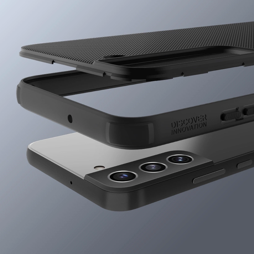 Pokrowiec składa się z elastycznej ramki z TPU i sztywnych plecków z PC. Ramka ułatwia zakładanie etui na telefon, a plecki usztywniają całą konstrukcję. Narożniki są ukształtowane w taki sposób, żeby działały jak zderzaki w samochodzie i absorbowały energię uderzenia. Podwyższone ranty dookoła tylnego aparatu i ekranu oddzielają te elementy od podłoża, na którym mogły by zostać porysowane.