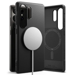 Etui z serii Onyx Magnetic Magsafe od firmy Ringke wykonane jest z miękkiego i wytrzymałego tworzywa termoplastycznego, dodatkowo wzmocnionego na krawędziach by jak najlepiej chronić urządzenie. Nieco podniesiona forma obudowy wokół aparatu i ekranu chroni go przed zarysowaniami, unosząc telefon tuż nad powierzchnią płaską. Posiada osłony na przyciski, wycięcia na porty i smycz.