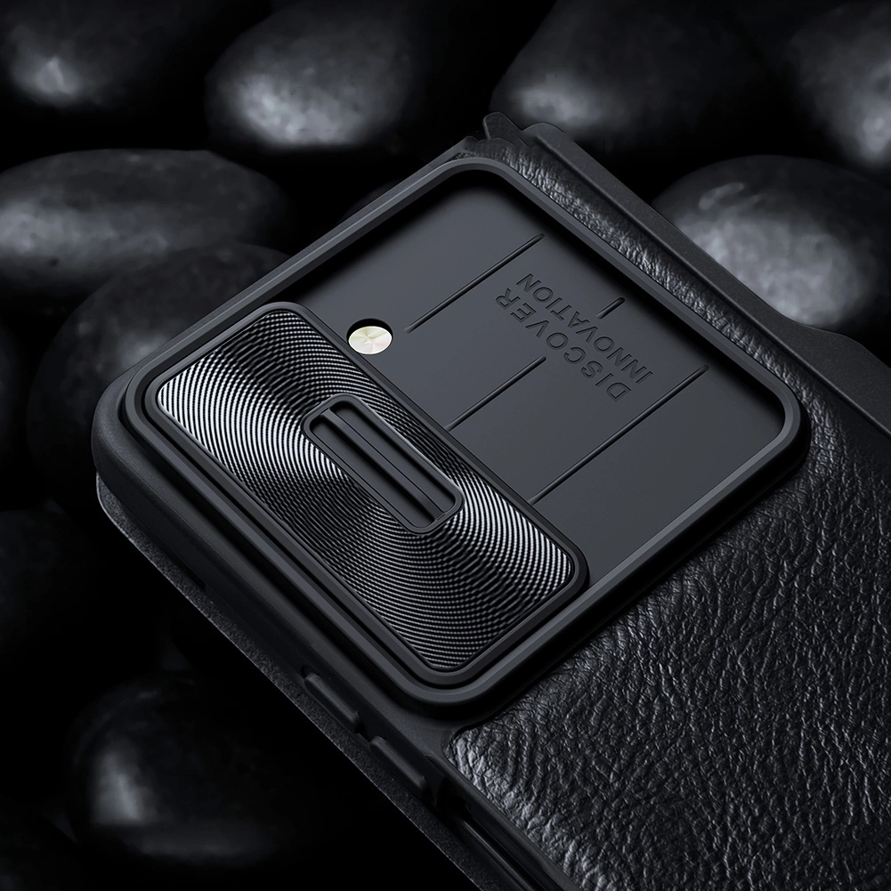 Etui Nillkin Qin Leather Pro Case klasyczne skórzane etui z klapką. Pokrowiec jest dopasowany do Samsung Galaxy Z Fold 5, doskonale chroni go przed zniszczeniami wskutek upadków lub zarysowań (na przykład przez noszone w kieszeni klucze). Pokrowiec posiada przesuwaną osłonę na tylny aparat. Dzięki niej szkło kamery jest chronione przed porysowaniem a także uniemożliwia dostęp do nieautoryzowanego nagrywania obrazu. Podniesione krawędzie dookoła ekranu zabezpieczają go od zarysowania kiedy ten leży na płaskiej powierzchni.