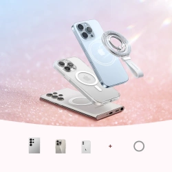 Silne magnesy zapewniają błyskawiczne i stabilne połączenie z MagSafe oraz etui magnetycznymi, a dodatkowy pierścień metalowy umożliwia użycie uchwytu także z innymi smartfonami.