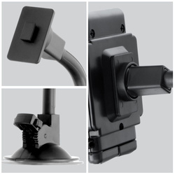 Wykonany z wysokiej jakości tworzywa uchwyt daje Ci kilka opcji montażu. Dzięki regulowanemu ramieniu i wzmacnianej dodatkowym zaciskiem przyssawce można go umieścić na szybie lub gładkiej powierzchni deski rozdzielczej. Jeśli jednak zależy Ci na zminimalizowaniu ewentualnych problemów z widocznością i tym samym zwiększeniu bezpieczeństwa, wystarczy odmontować ramię od uchwytu, a następnie umieścić go w kratce wlotu. W obu przypadkach solidne mocowanie gwarantuje, że nawet przy bardzo wyboistych drogach urządzenie utrzyma się na swoim miejscu i nie ulegnie uszkodzeniu.