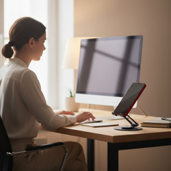 Fold Stand 3 pozwala na precyzyjne ustawienie kąta nachylenia, co zwiększa komfort podczas rozmów wideo, oglądania treści czy pracy z aplikacjami. Dodatkowo uchwyt osadzony jest na obrotowym elemencie, który umożliwia płynne obracanie całej konstrukcji o 360°, bez konieczności podnoszenia lub przesuwania podstawki. W zestawie znajduje się również klucz imbusowy do regulacji oporu zawiasów.