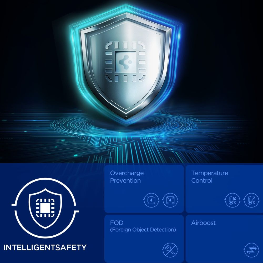 Dzięki aktywnemu chłodzeniu Peltiera z funkcją AirBoost uchwyt kontroluje temperaturę telefonu, zapewniając stabilne i szybkie ładowanie nawet podczas długich tras i w wysokich temperaturach. System FOD (Foreign Object Detection) wykrywa obecność metalowych lub niepożądanych przedmiotów w strefie ładowania, a funkcja Overcharge Prevention chroni baterię telefonu przed przeładowaniem, zwiększając bezpieczeństwo i żywotność urządzenia.
