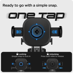 Spigen UTS35 OneTap to uniwersalny uchwyt samochodowy, montowany do deski rozdzielczej, szyby lub na tył ekranu. Idealne rozwiązanie dla osób, które poszukują trwałego i stabilnego mocowania na telefon podczas każdej podróży.