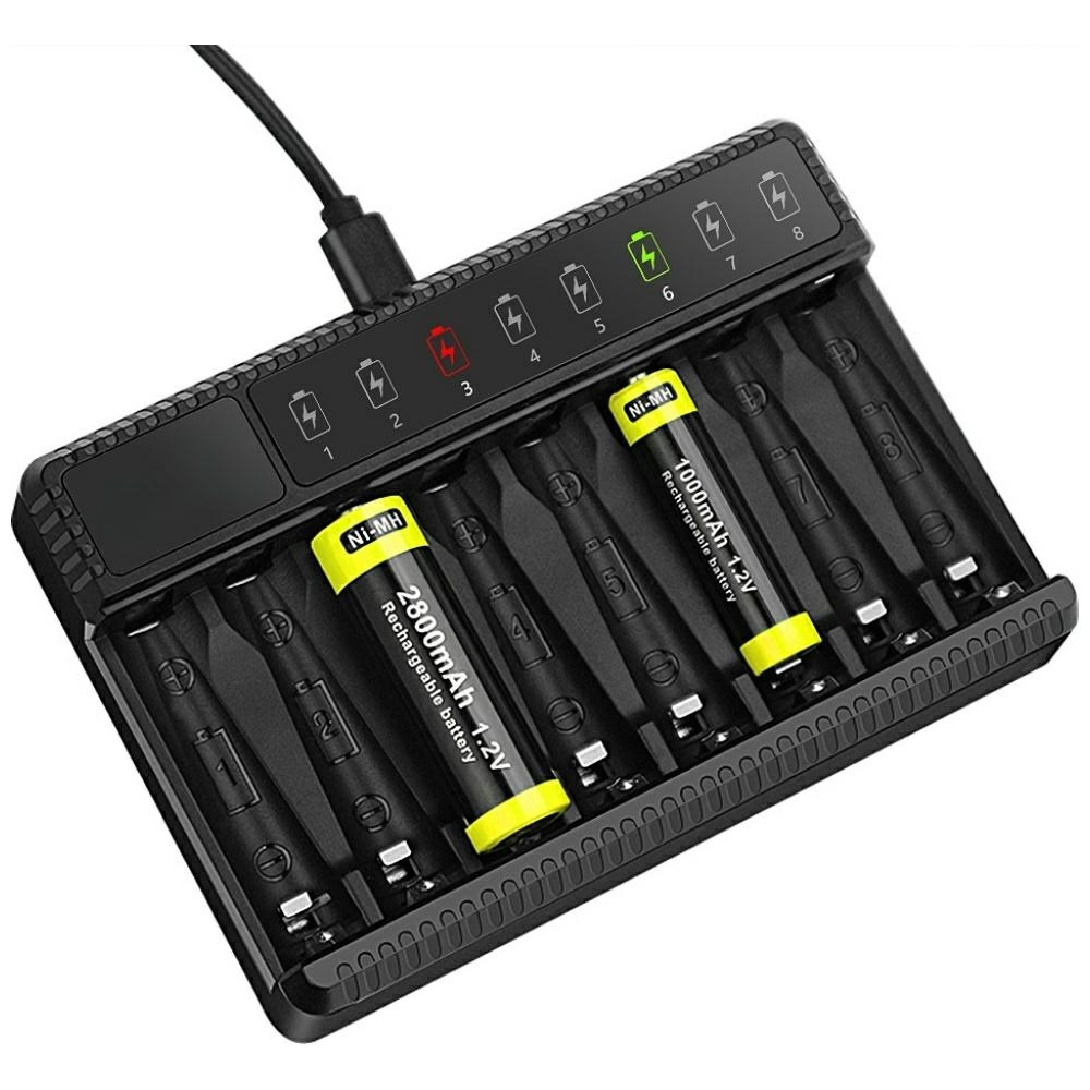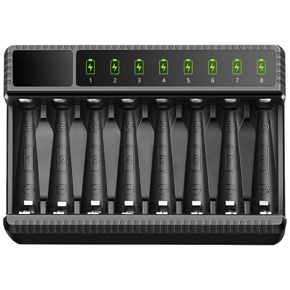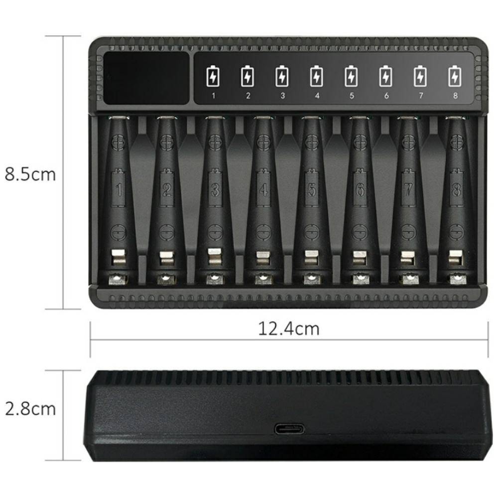 Parametry Wejście (Input): 5V == 2A (zasilanie przez kabel USB) Wyjście (Output): 1.48V == 0.6A × 8 Wyświetlacz LED: Każde z 8 gniazd posiada własny wskaźnik ładowania, informujący o stanie naładowania akumulatora Zabezpieczenia: Ochrona przed przegrzaniem, przepięciem i zwarciem Certyfikaty: CE, FCC, RoHS