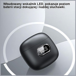 Urządzenie posiada wbudowany wskaźnik LED - wyświetla on stan baterii etui ładującego, jak i poszczególnej słuchawki. Jest to niezwykle przydatna funkcja, ponieważ możesz stale kontrolować poziom naładowania urządzenia.