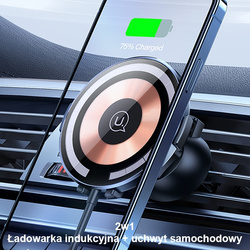 Uchwyt samochodowy jest jednocześnie bezprzewodową ładowarką, która pracuje w technologii Fast Charging. Ładowarka obsługuje ładowanie bezprzewodowe o maksymalnej mocy do 15W.