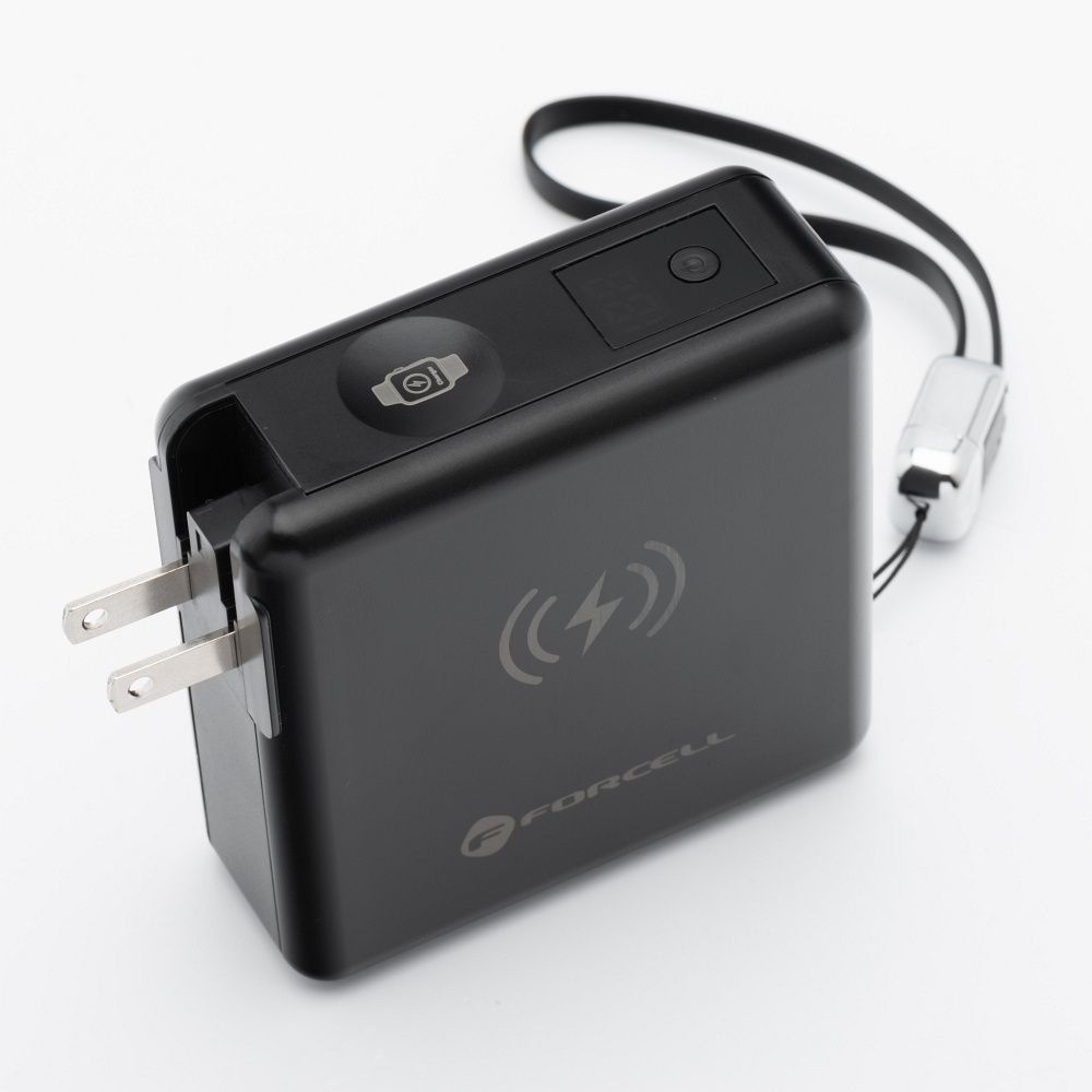 Ładowarka podróżna Forcell 6 w 1 to innowacyjne urządzenie, które łączy w sobie ładowarkę sieciową, powerbank o pojemności 15 000 mAh oraz funkcję bezprzewodowego ładowania. Dzięki obsłudze szybkiego ładowania, wymiennym wtyczkom oraz możliwości ładowania kilku urządzeń jednocześnie, w tym laptopa i Apple Watch, stanowi idealne rozwiązanie zarówno do użytku codziennego, jak i w podróży.