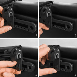 Dzięki regulowanym klamrom torba Wozinsky jest kompatybilna z wieloma bagażnikami rowerowymi. Aby zamontować ją na bagażniku, wystarczy zacisnąć klamry i zablokować dolny wspornik obrotowy. Za sprawą takiego mocowania torba trzyma się stabilnie, można ją też łatwo i szybko zdjąć z roweru.