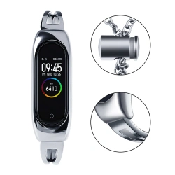 Elegancka opaska do zegarka Xiaomi Mi Band 3/4/5/6, w kolorze srebrnym. Wykonane z gładki stali nierdzewnej akcesorium ma ergonomiczny, dopasowujący się do budowy nadgarstka kształt. Opaska mocowana poprzez klips z dekoracyjnym łańcuszkiem, wykończonym cyrkonią.