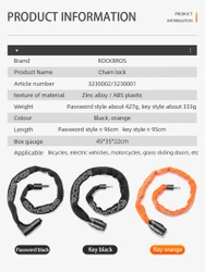 Wyróżnij się w tłumie dzięki zapięciu rowerowemu Rockbros 3230002001, które łączy w sobie wytrzymałość stopu cynku z elastycznością ABS. Oferując długość łańcucha 0.95m oraz możliwość otwierania zarówno kluczem, jak i szyfrem, jest to idealny wybór dla poszukujących zarówno bezpieczeństwa, jak i wygody.